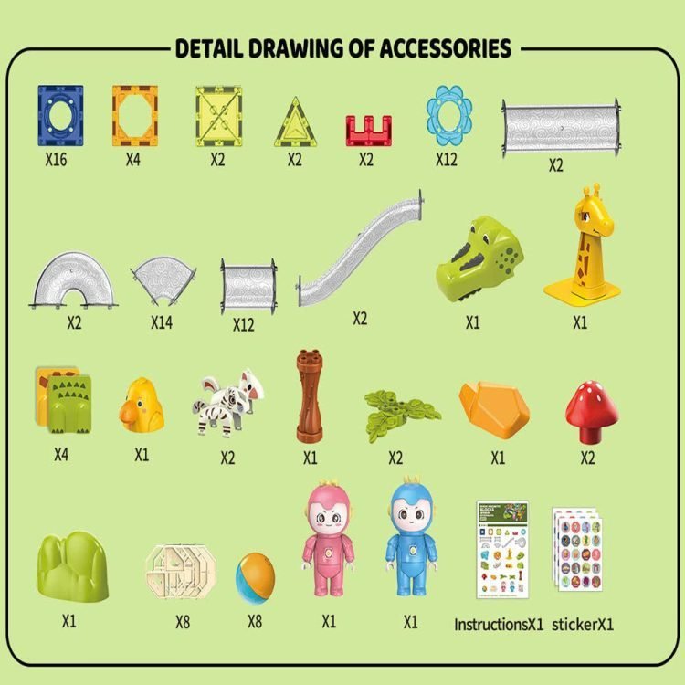Immersive Learning Experience: Introduce your child to an exciting world of creativity and learning with our 104-Piece Magnetic Animals Park Paradise Building Blocks Set. This engaging toy combines magnetic blocks, rolling ball tracks, and animal figures, providing an immersive and educational playtime experience.