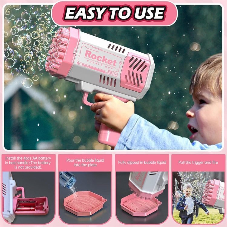 • The bubble machine has 40 holes with colorful lights that can generate more than thousands bubbles per minute. whatever day or night, Just press the trigger then rich colorful bubbles will be blown out, cool lights and colorful bubbles are combined perfectly, easy to create a wonderful romantic atmosphere at day and night, which is loved by children and adults. Tips: Bubbles will appear after about 5 seconds when first use.
