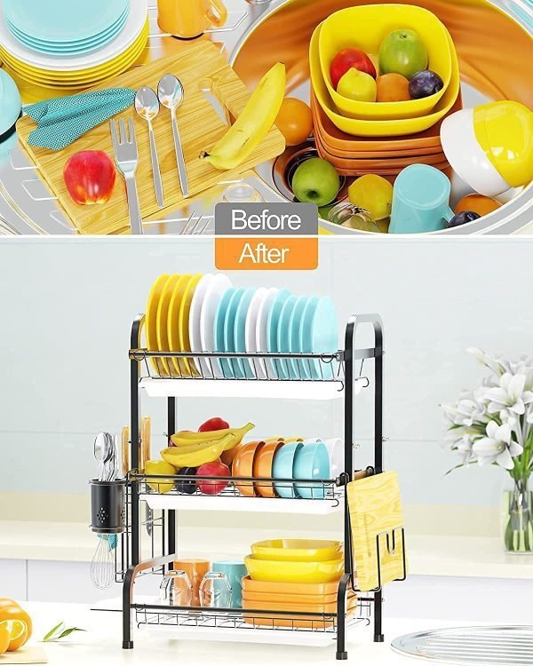 - 3 Tier Large Capacity: With 3 tiers design, the drying rack dishes provide much space to store different sizes of dishes, bowls, cups, pots and other tableware. Also with utensil and cutting broad holder to keep your kitchen clean and organized