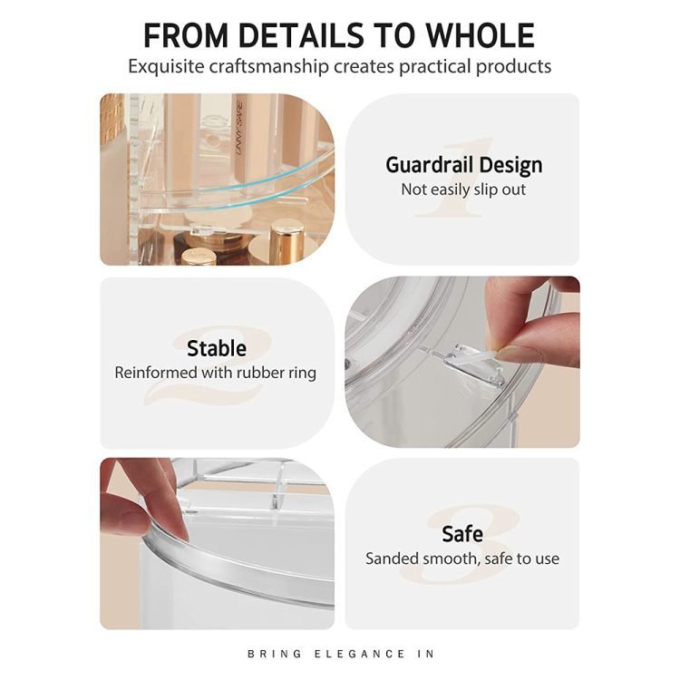 • 360? Rotation Organizer & Large Capacity: Perfectly organizes and stores your cosmetics; enables easy access to all of your makeup and products. Hold at least 30 makeup brushes, 20 skincare products and other accessories including lipsticks, nail polish, eyeliner and more cosmetics.