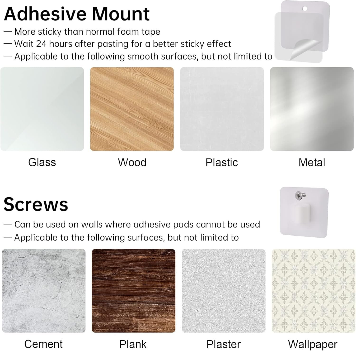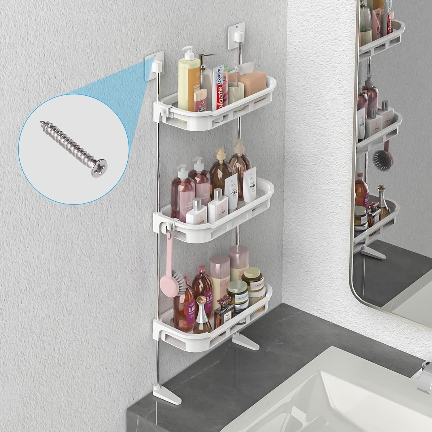 - ? 2 Installation Methods for All Walls Both screw mounting and no-drill hook mounting are available for this above toilet storage rack. It is suitable for all types of bathroom walls and offers a wider range of applications and safer installation.