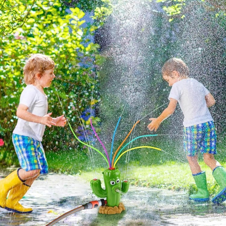 - ?Cactus Water Sprinkler for Kids?This water spraying toy has 6 colored wiggle tubes and 1 hose connector, both arms and nose of the cactus will spray water, enjoy the fun of spraying water while watering the lawn.