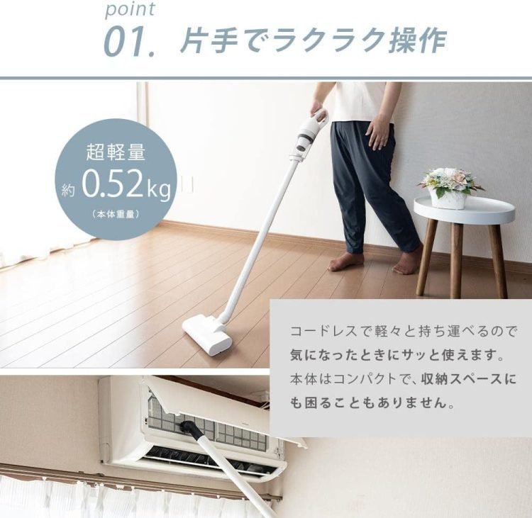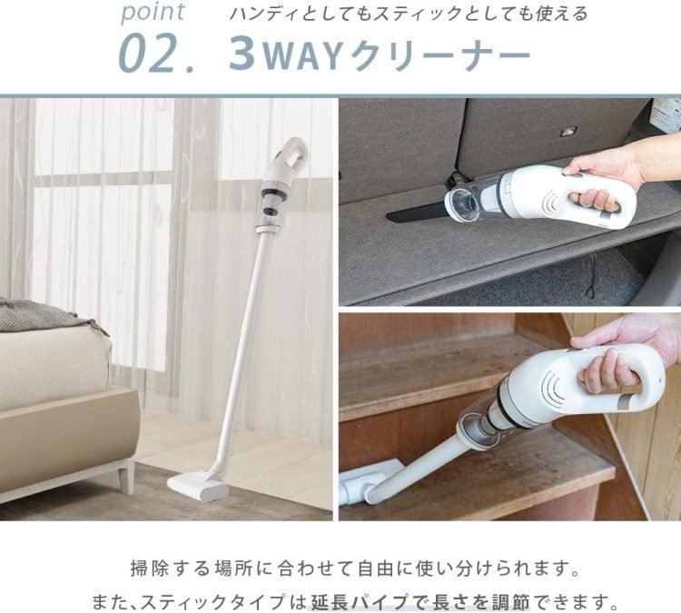 • 3-way cordless cleaner (can connect 1 or 2 extension pipes)