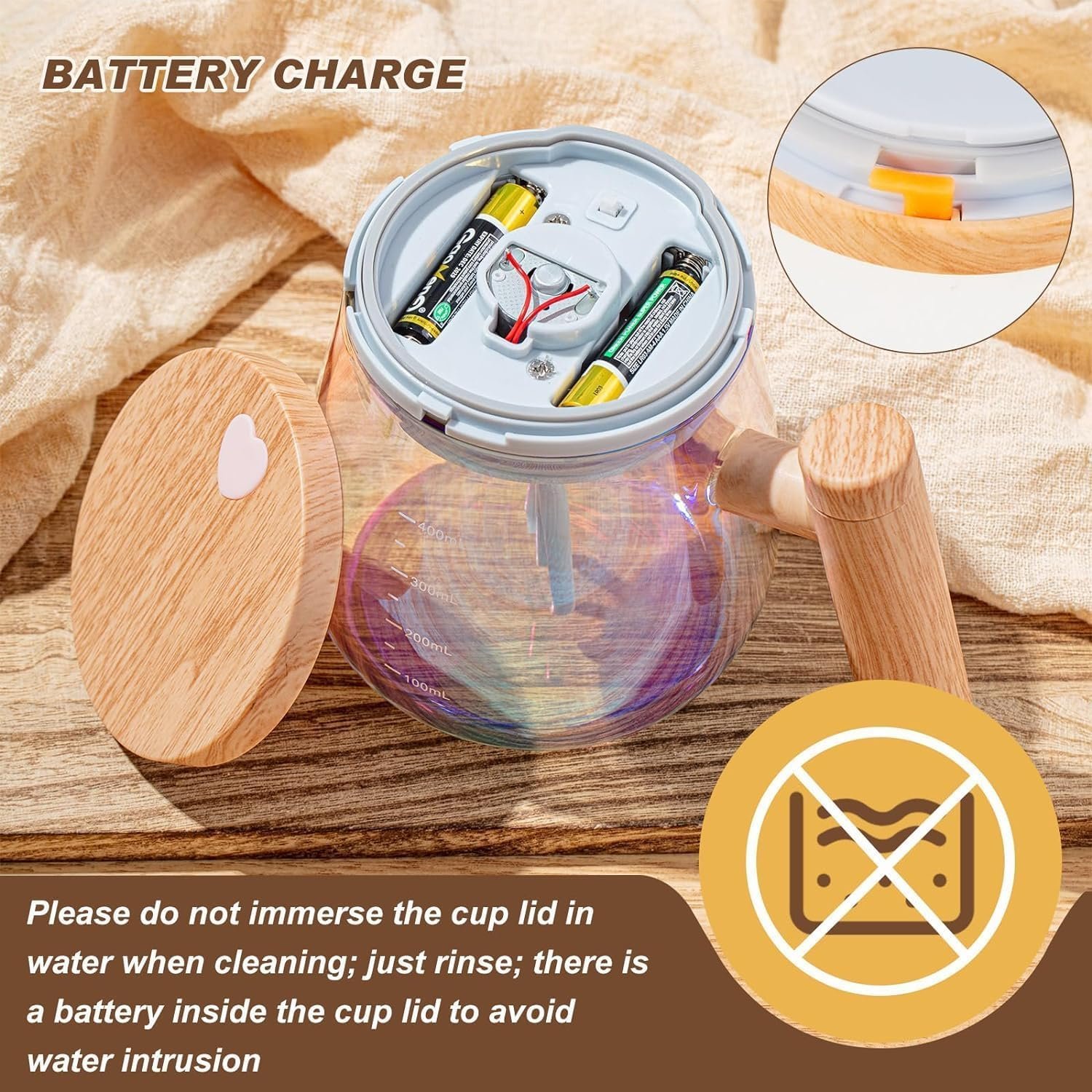 - 【High-Quality Materials】 Mixing mug made of high borosilicate glass and high-quality wood imitation plastic, easy to deal with changes in cold and heat, no bursting in sudden cooling and sudden heating, low-temperature resistance -30°, high temperature resistance 150°. Self stirring coffee mug just install 2 batteries AAA to use it (not included).
