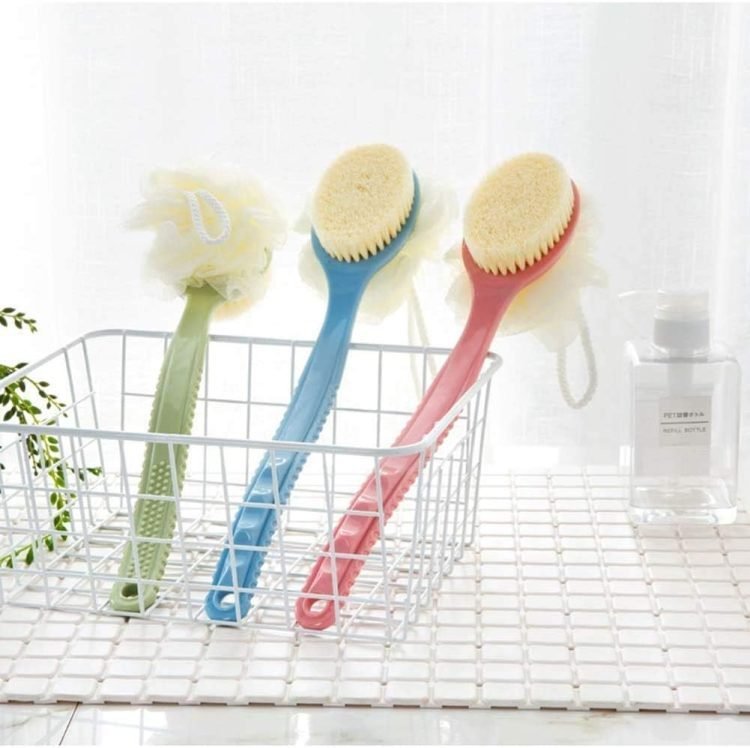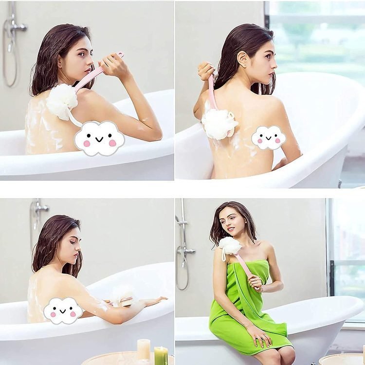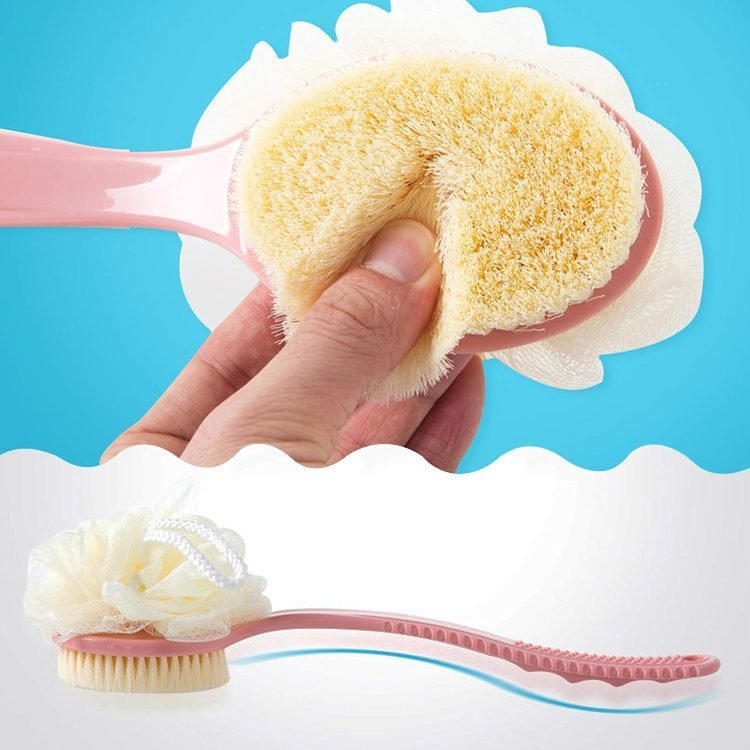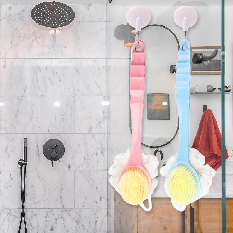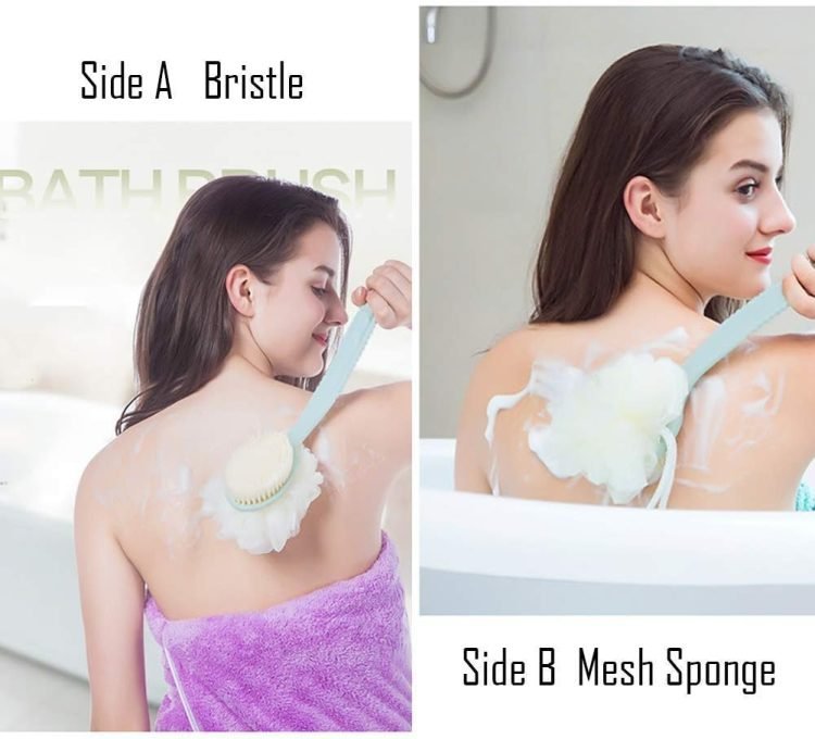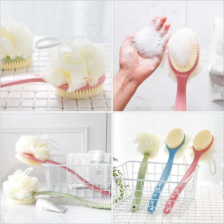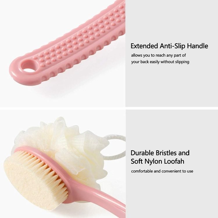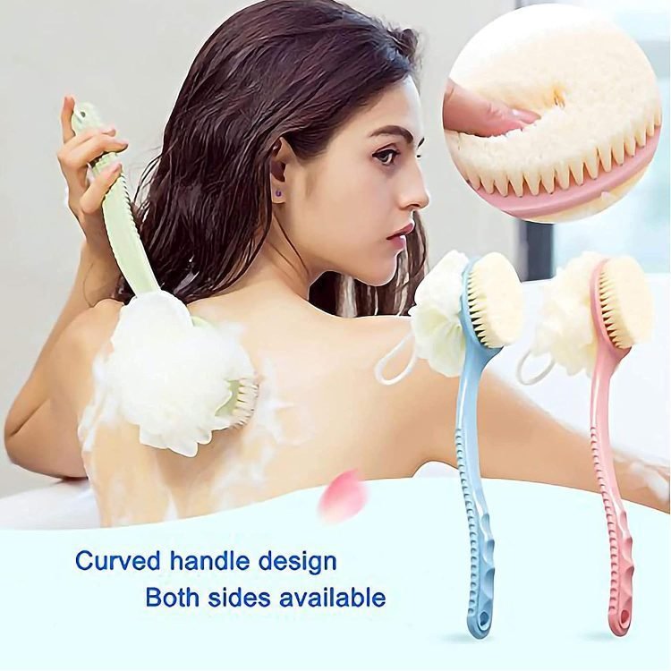 Shower Body Brush with Bristles and Loofah, Bmyko Back Scrubber Bath Mesh Sponge for Shower, with Curved Long Handle Back Wahser for Skin Exfoliating Bath