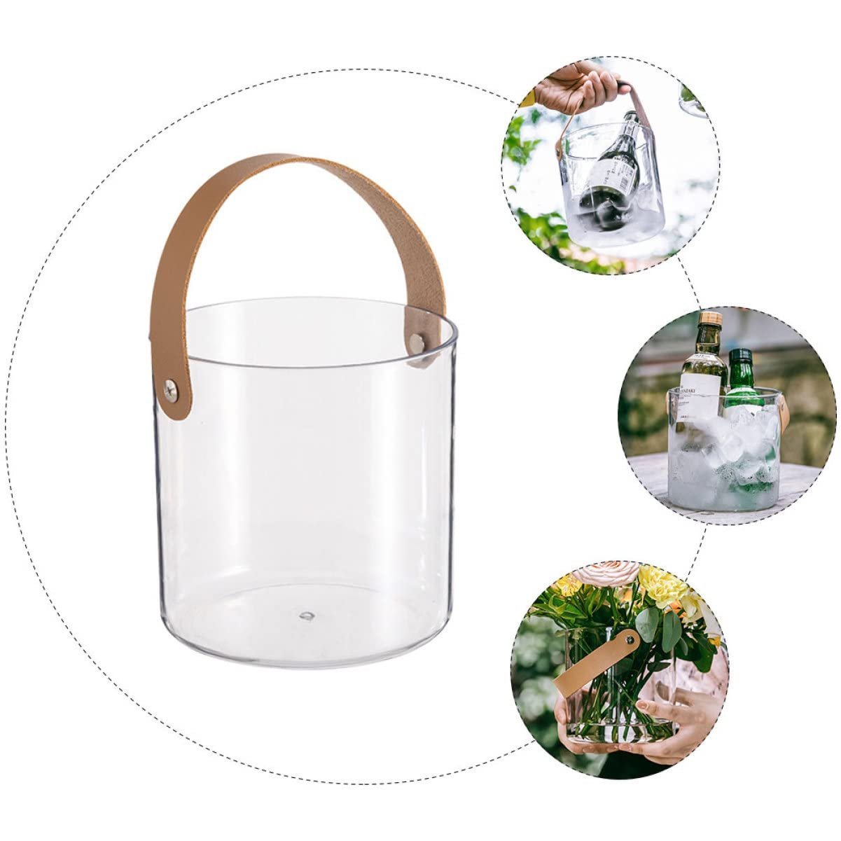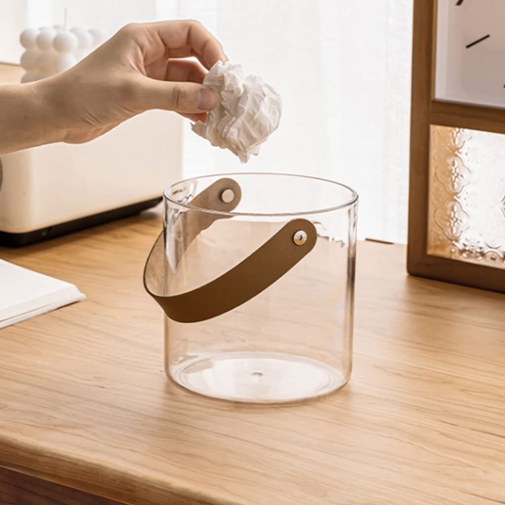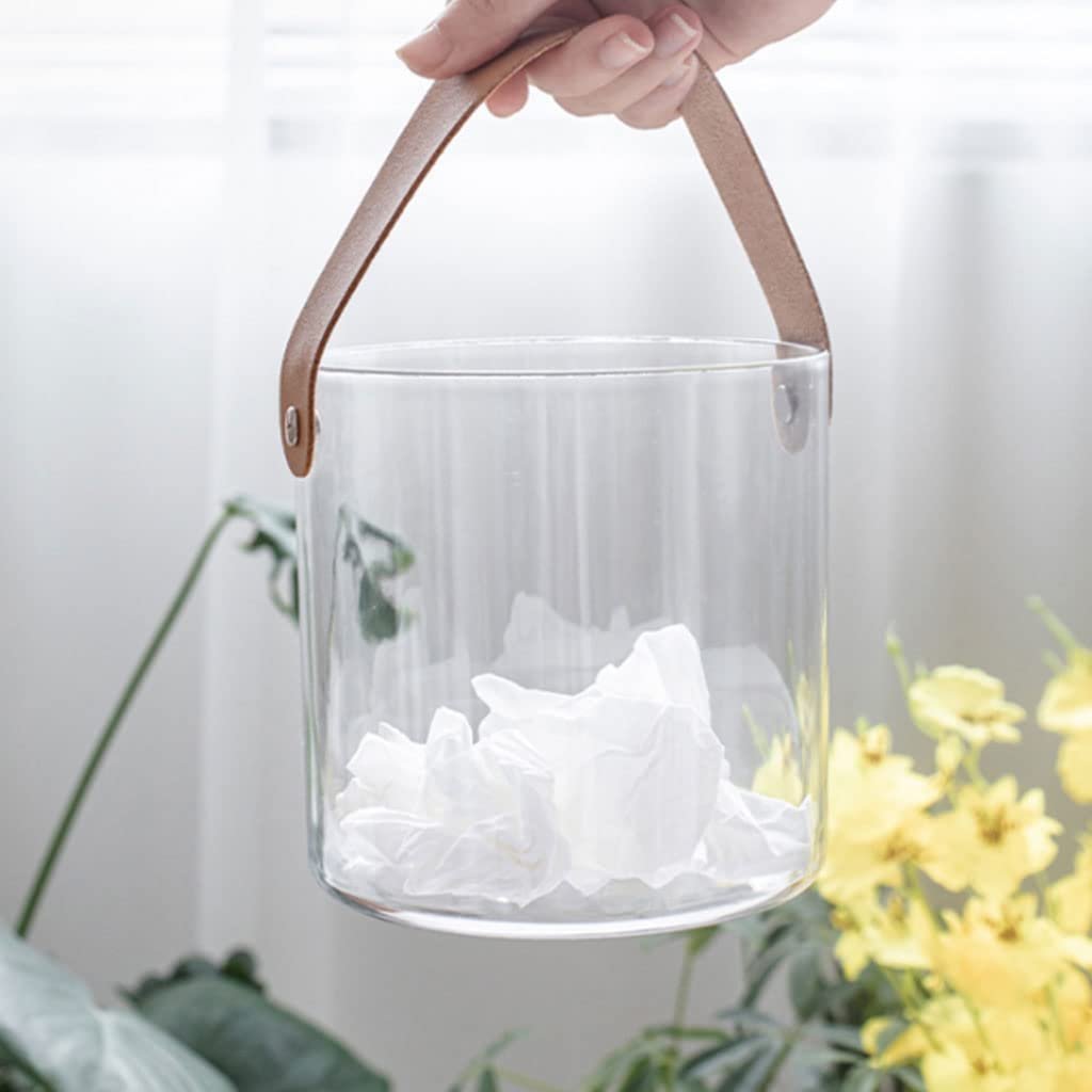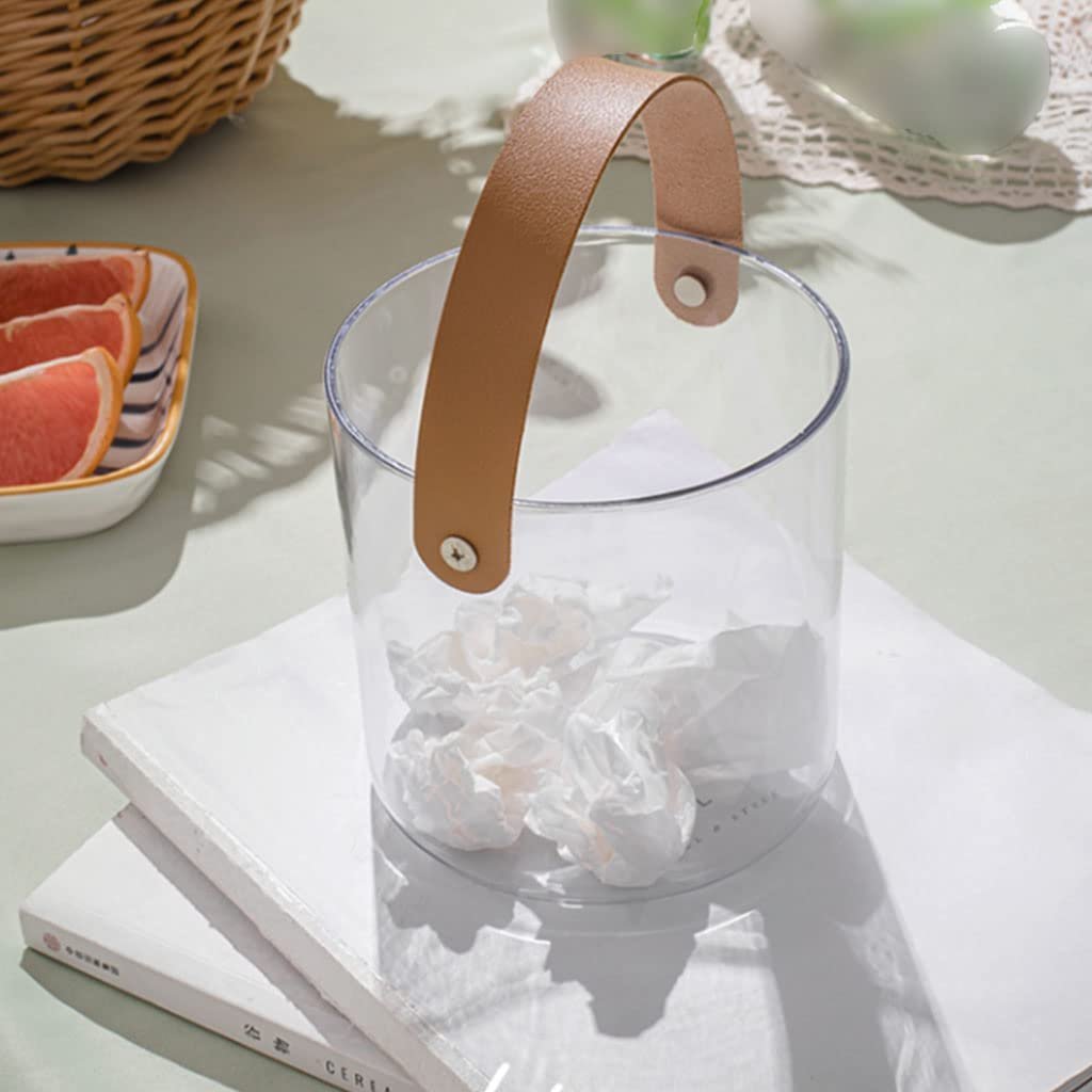 - Plastic trash can with leather strap, easy to lift and move, can also be hung.